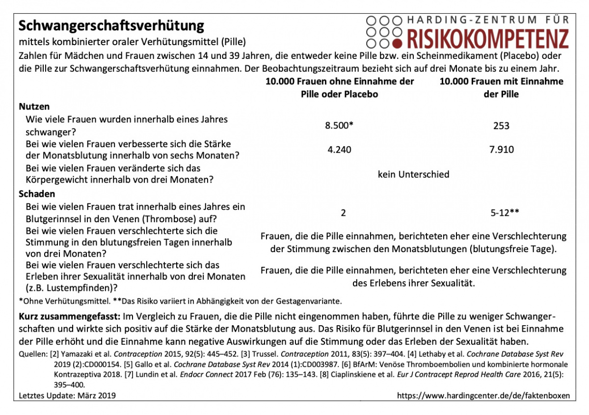 Diese Faktenbox soll Ihnen helfen, möglichen Nutzen und Schaden der Pilleneinnahme zur Schwangerschaftsverhütung abzuwägen. Die Informationen und Zahlen stellen keine endgültige Bewertung dar. Sie basieren auf den derzeit besten wissenschaftlichen Erkenntnissen.